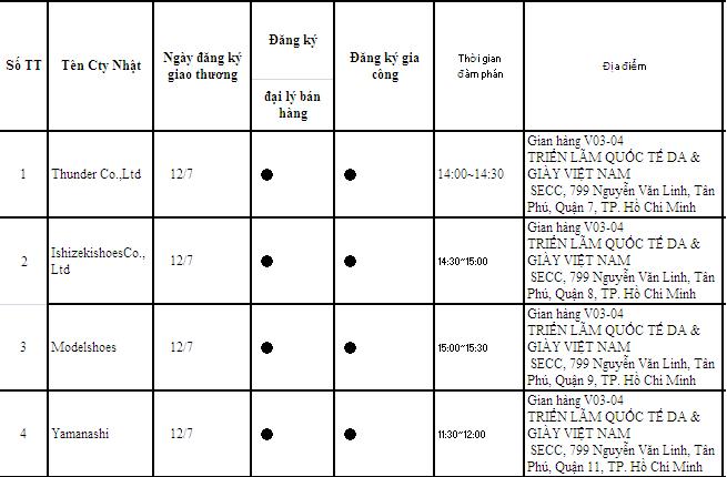 Với sự phối hợp chặt chẽ của Thương vụ - Đại sứ quán Việt Nam tại Nhật Bản và Forval Corporation, Blessing of Shoe’s Market Festival đã lựa chọn và cử 5 doanh nghiệp hàng đầu của Hiệp hội giầy da Tokyo Asakusa sẽ đại diện tham gia Triển lãm Quốc tế Da - Giày Việt Nam lần thứ 19 sẽ diễn ra từ ngày 12 - 14/7/2017 tại Trung tâm Hội chợ và Triển lãm Sài Gòn (799 Nguyễn Văn Linh, Phường Tân Phú, Quận 7. TP HCM).
